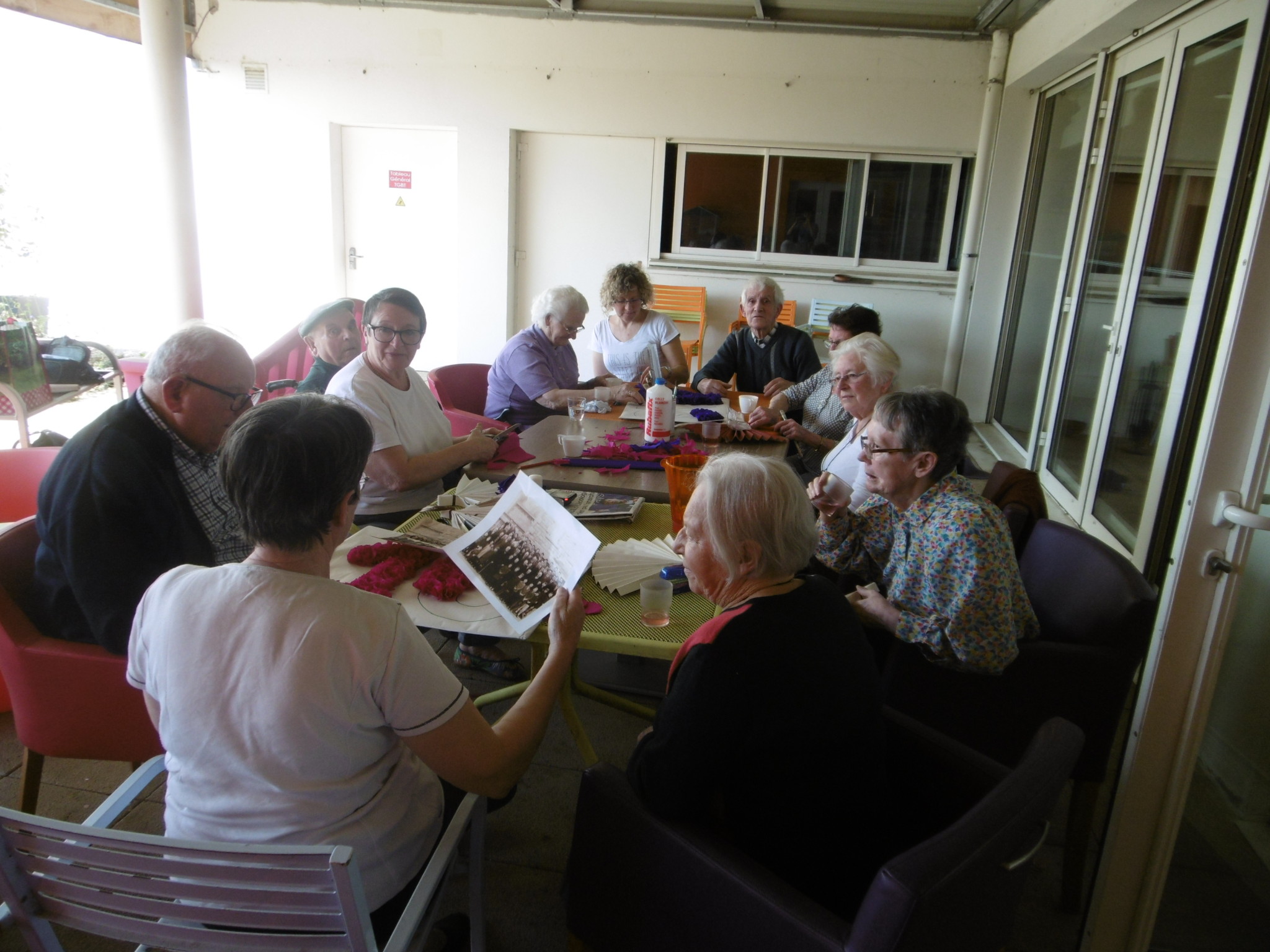 Les travaux manuels avec les bénévoles et les familles : confection d’une banderole en papier crépon « 10 ans ».